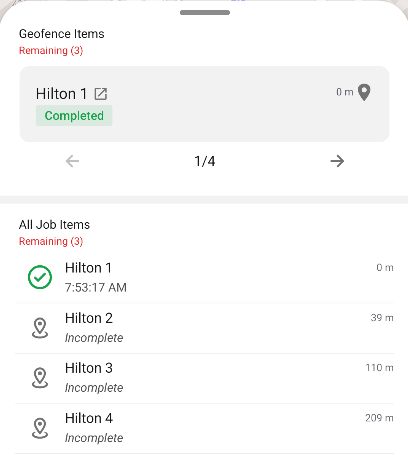 The Job Items List Menu can be accessed by selecting the Job Items List button or by selecting a geofence zone on the map. This view will show you the current completion state of each geofence item and its distance from your current location. Using the arrows or swiping on the item cards will allow you to change item selection.